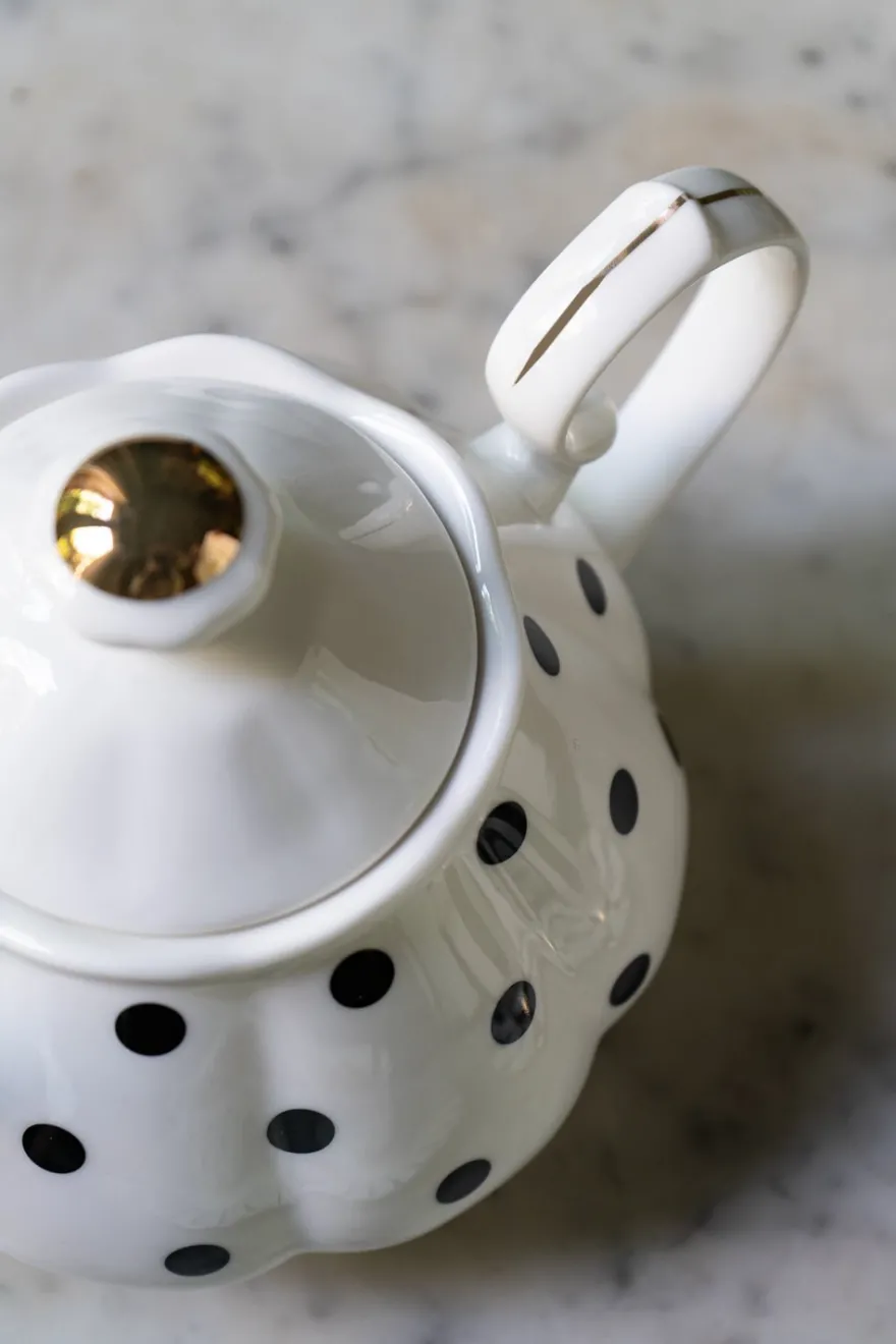 Tetera de color blanca con diseño de puntos negros y detalles dorados, de nuestra icónica vajilla blanca y negra de New Bone China, reconocida por ser muy fina, ligera y resistente.
