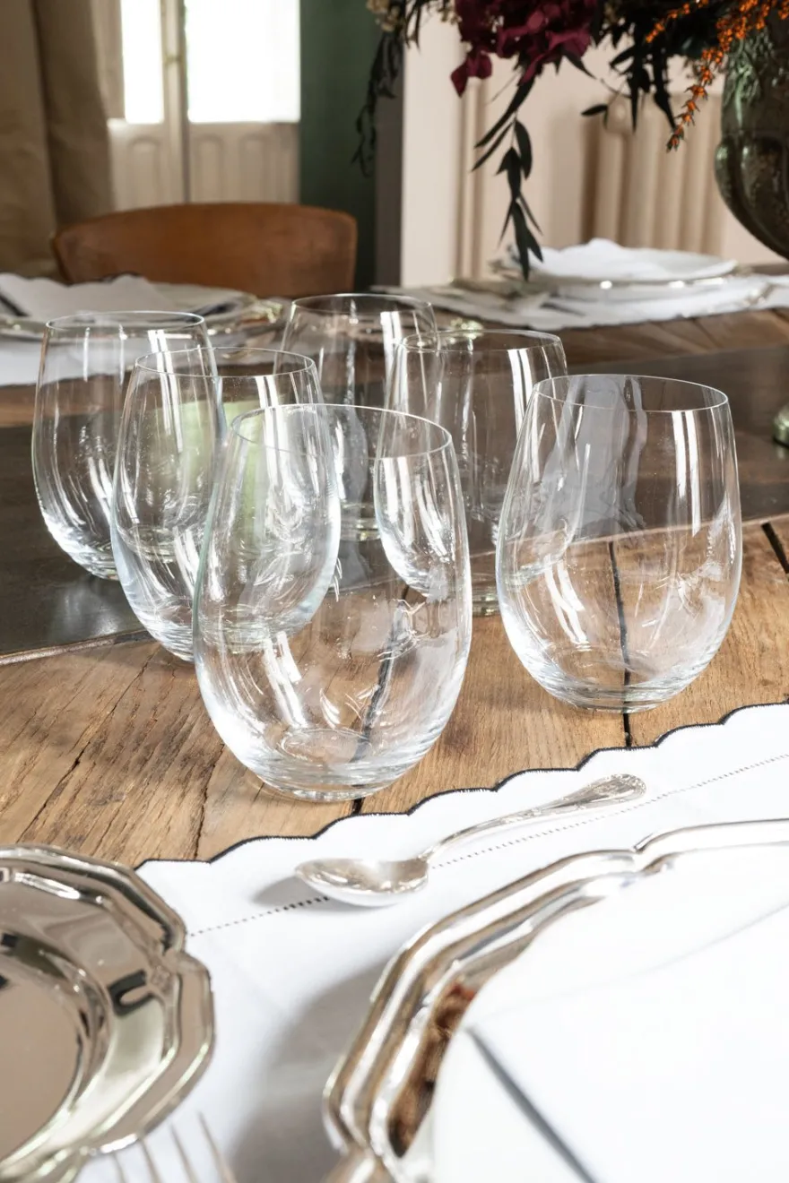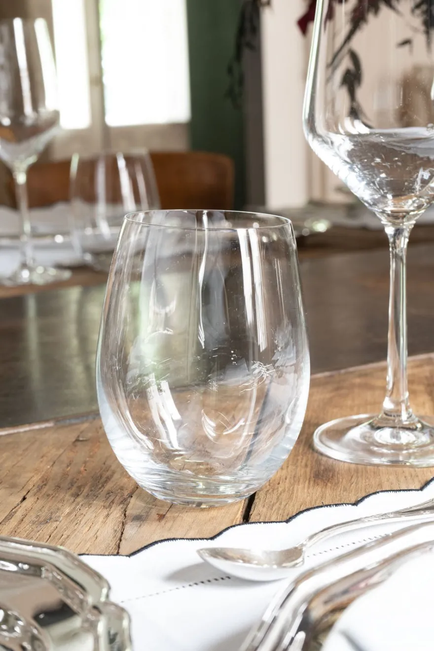 Set de seis vasos de cristal, anchos y finos, ya que sus bordes están cortados con láser fino.