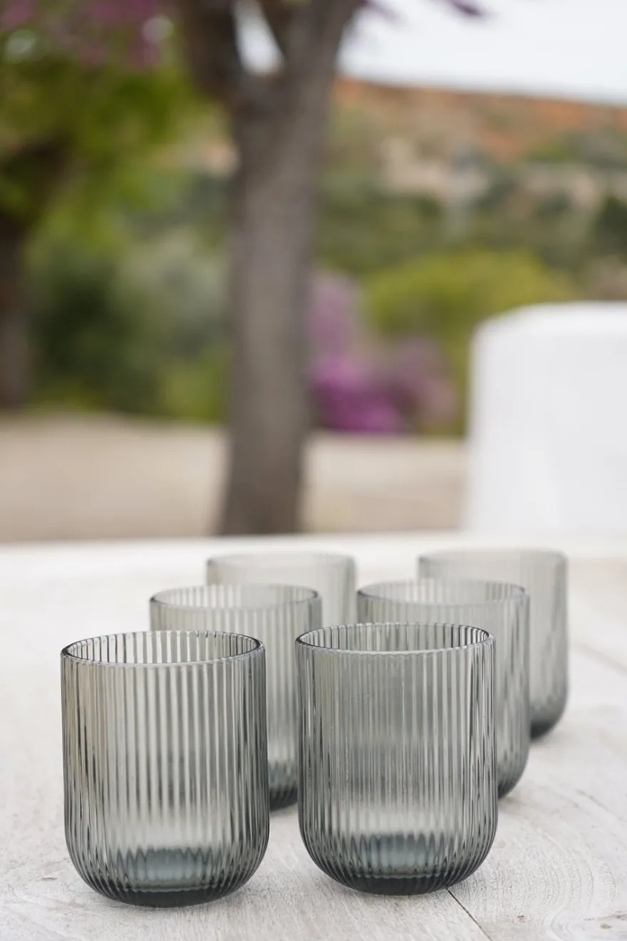 Set de seis vasos de cristal de diseño en color grises, ideales y versátiles para complementar todo tipo de mesas en cualquier época del año.