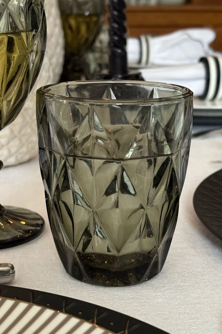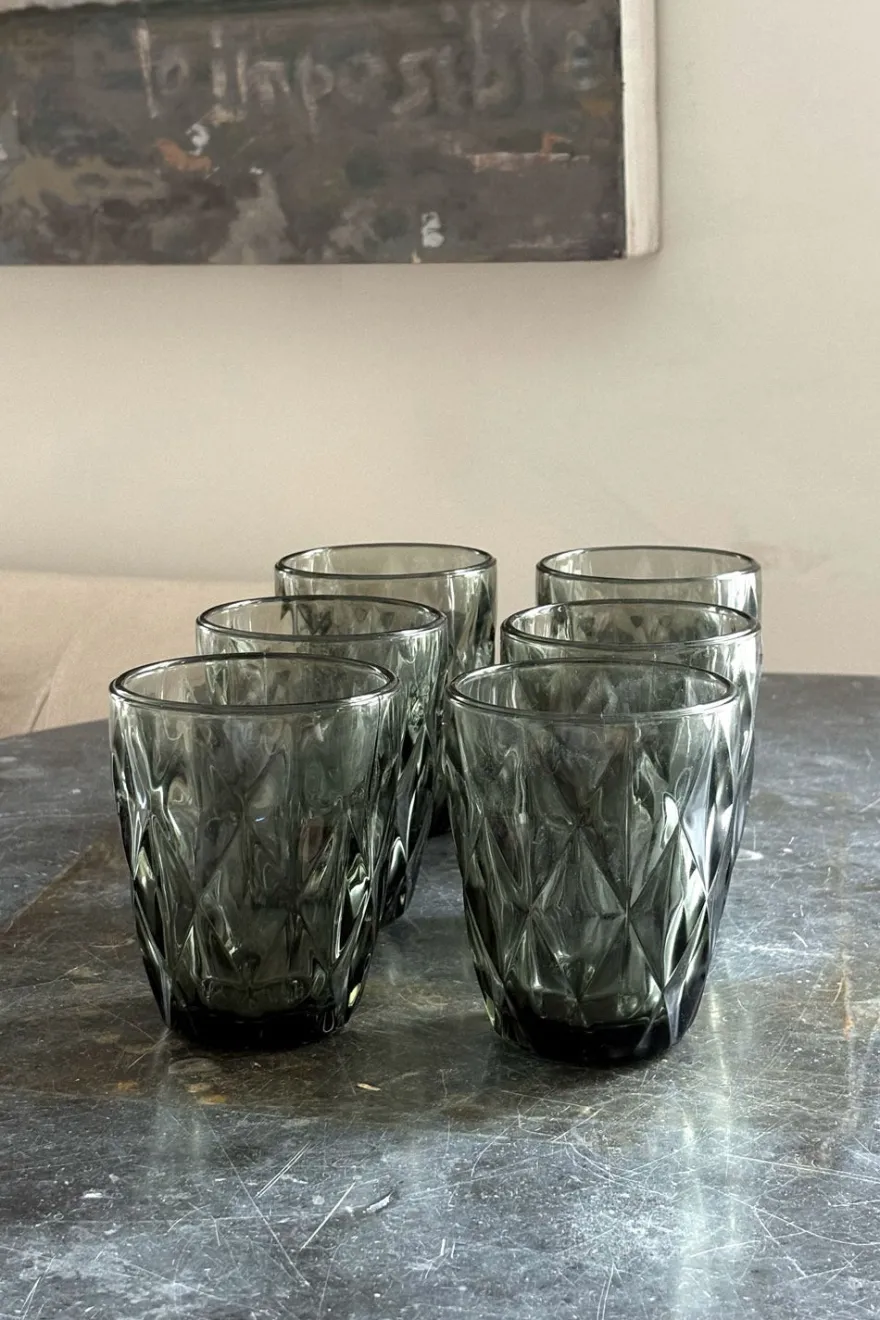 Set de seis vasos de cristal con diseño de rombos en color gris, ideales para quienes buscan añadir un aire de distinción y versatilidad, ya que combinan fácilmente con diferentes estilos de decoración y mesas.