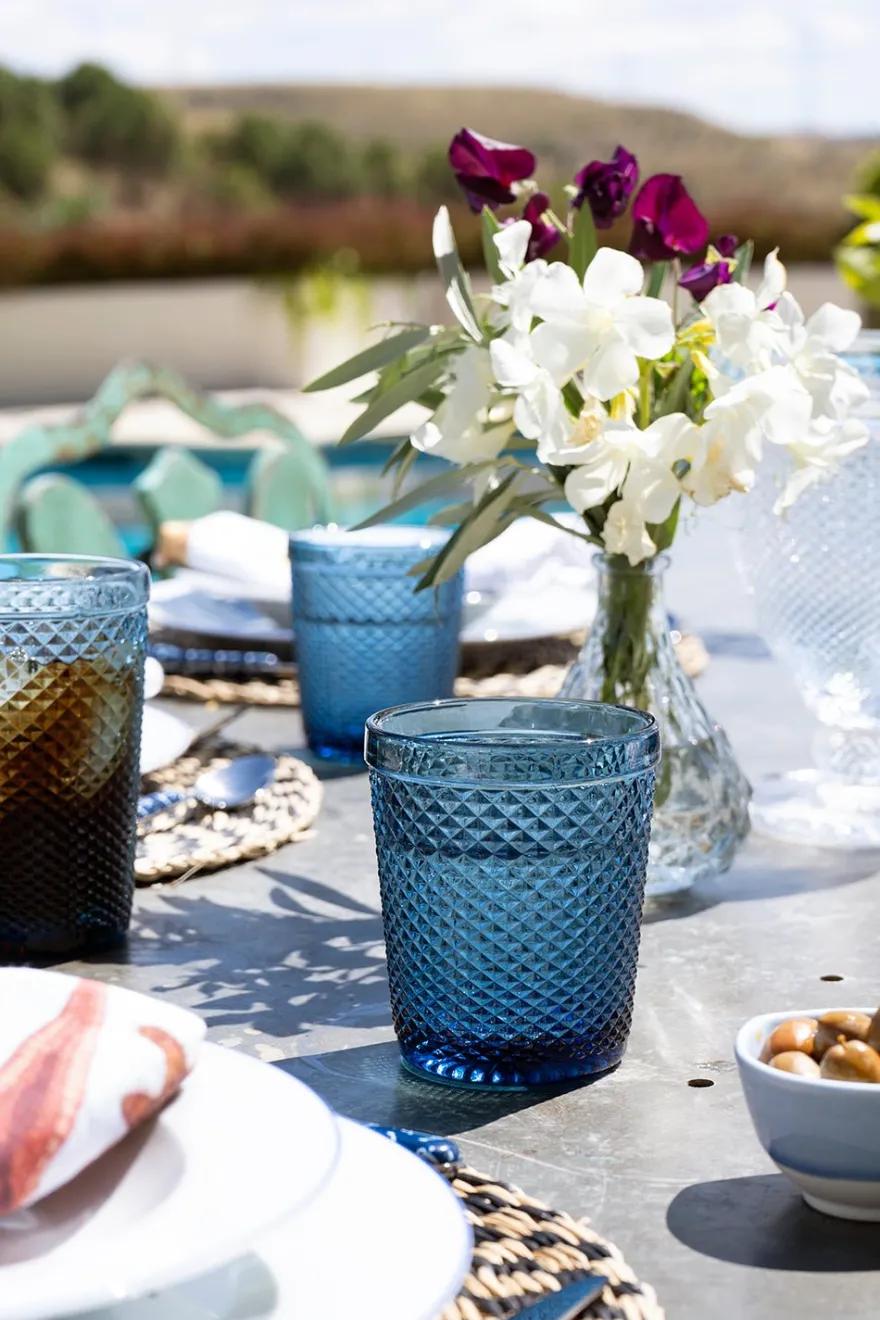 Vaso de cristal tallado con picos teñido en color azul oscuro, ideal para cualquier ocasión.