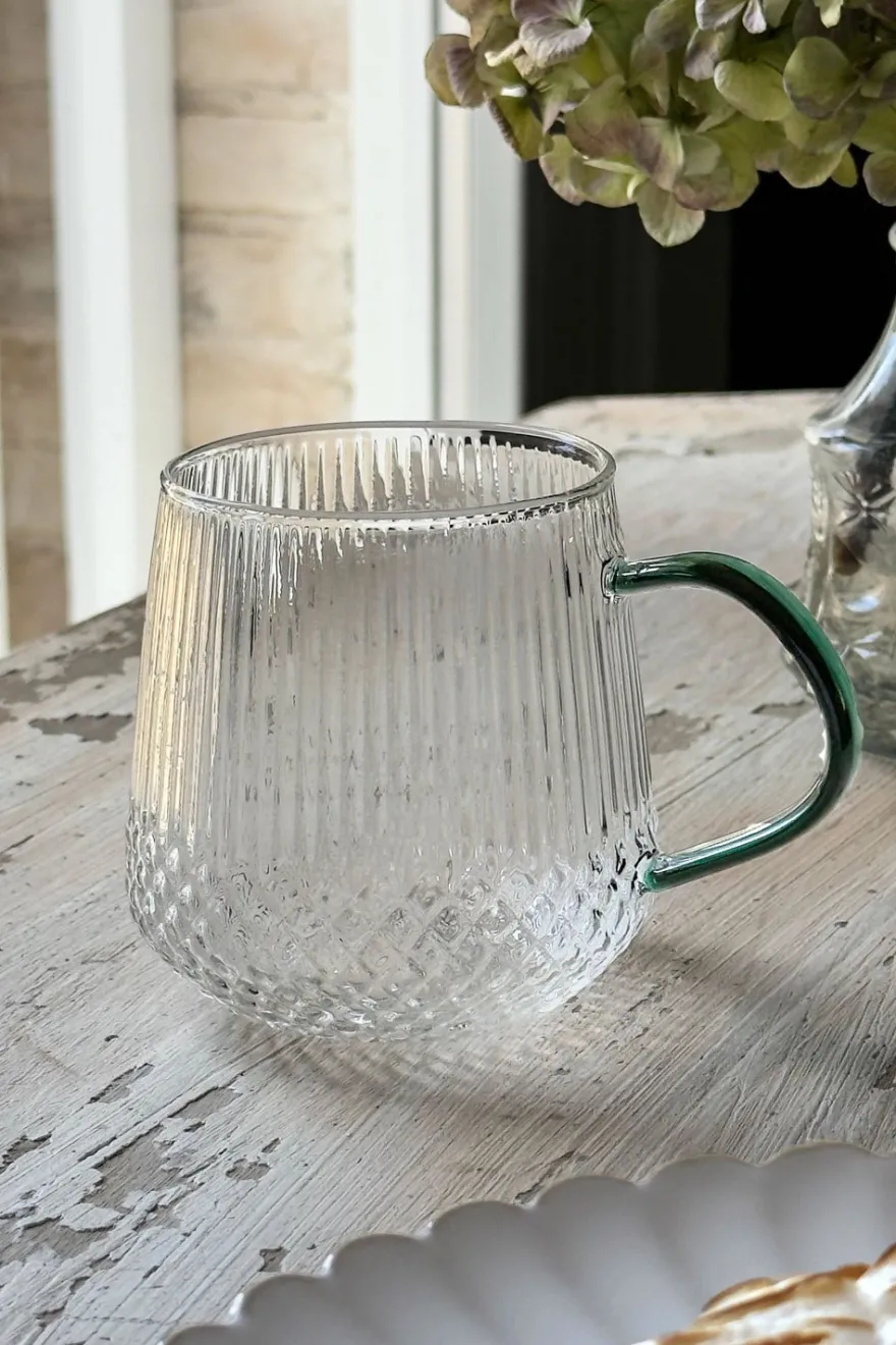 Vaso de cristal con detalles tallados y asa de color, disponible en amarillo, negro o verde, que aporta un toque distintivo y sofisticado. Ideal para elevar cualquier mesa, tanto en el día a día como en ocasiones especiales.