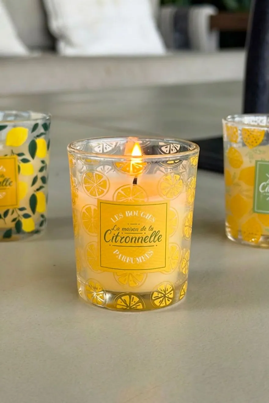 Vela de parafina en vaso de vidrio con fresco aroma a citronela que no solo proporciona un ambiente relajante, sino que también actúa como un repelente natural. Un diseño práctico que aporta estilo a cualquier espacio, ya sea en el jardín, terraza o balcón.