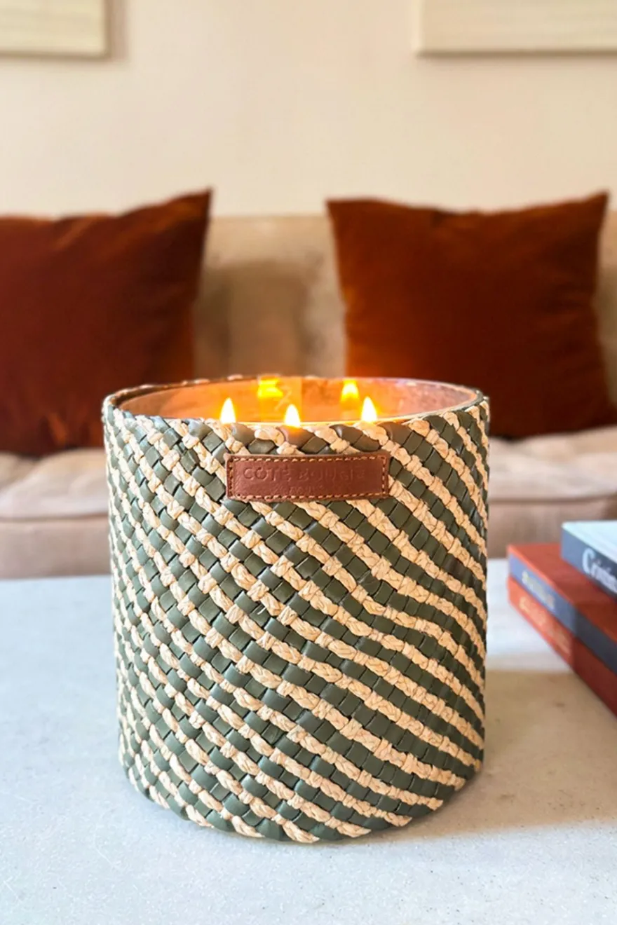 La elegancia artesanal y el saber hacer marroquí se unen en esta vela de cuero y rafia trenzada a mano, ofreciendo un viaje olfativo a través de Marruecos. Cada vela es única y artesanal.
