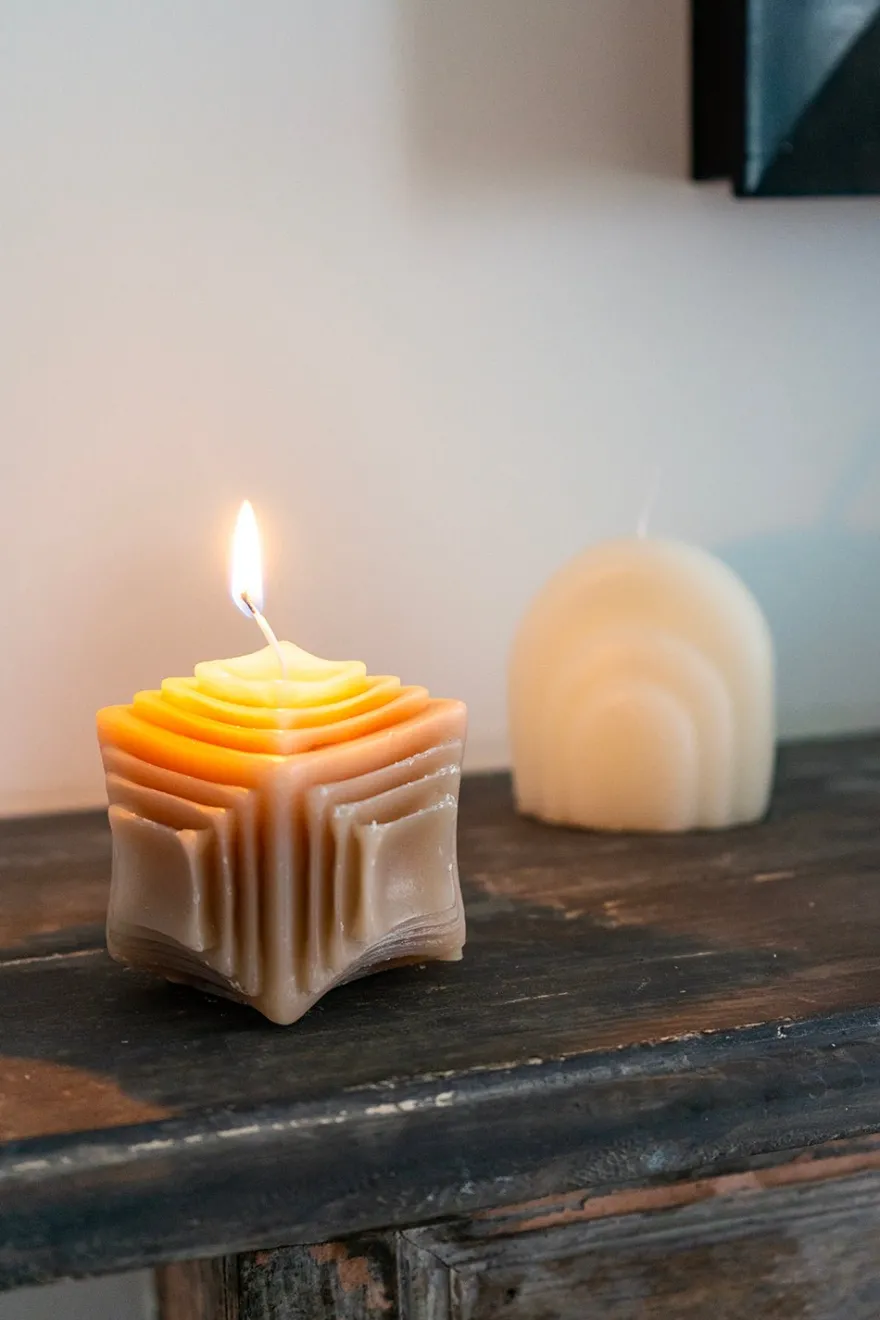 Vela de cera con forma cuadrada y relieves de distintos tamaños, original e ideal para decorar cualquier rincón de tu casa.