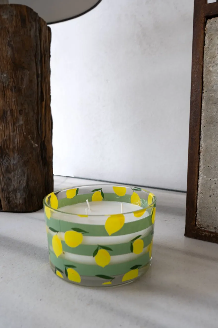 Vela de parafina en vaso de vidrio con tres mechas y aroma a citronela.
